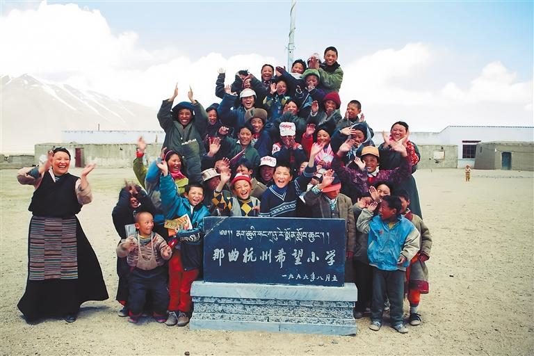 那曲杭州希望小學(xué)建成時(shí),老師和學(xué)生在石碑前合影留念。色尼區(qū)委宣傳部提供