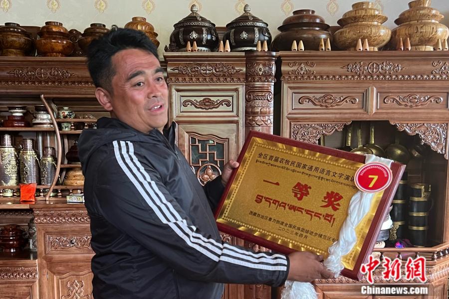 “這是我去年獲得的西藏自治區(qū)首屆農(nóng)牧民國(guó)家通用語(yǔ)言文字演講比賽一等獎(jiǎng),我當(dāng)時(shí)演講的主題就是民族團(tuán)結(jié)?!痹诹种ユ?zhèn)嘎拉村黨支部宣傳委員、村委會(huì)副主任尼瑪多吉家中,主人正自豪地向記者們展示著獲獎(jiǎng)牌匾。