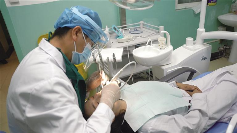 天津市第十批援藏干部、昌都市藏醫(yī)院口腔科副主任醫(yī)師杜斌正在對患者開展口腔治療。記者 貢曲羅杰 鄭常容