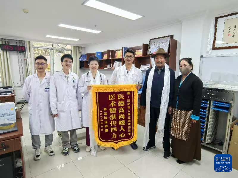 “突切囊,突切囊(非常感謝)?!被颊呒迎偧磳㈦x院之際,特意向主治醫(yī)生索朗和郭麗珠獻(xiàn)上哈達(dá)和錦旗。