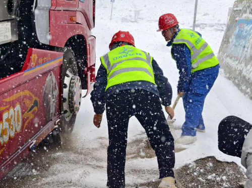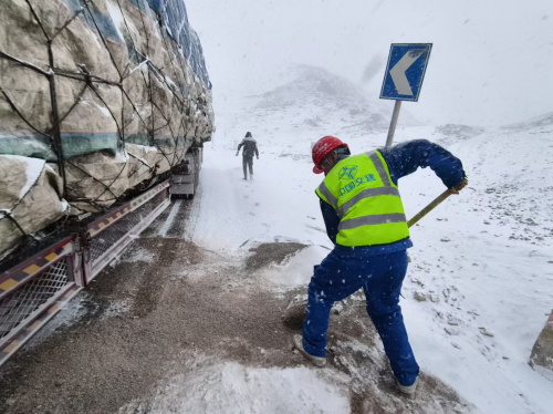 事發(fā)時(shí),強(qiáng)降雪導(dǎo)致路面濕滑,卡車(chē)在行駛過(guò)程中出現(xiàn)打滑,甚至有滑坡的風(fēng)險(xiǎn)。駕駛員在緊急制動(dòng)過(guò)程中,車(chē)輛失控,險(xiǎn)象環(huán)生。在這危急關(guān)頭,途經(jīng)此地的中交建設(shè)者們毫不猶豫地伸出援手。他們冒著嚴(yán)寒,鋪設(shè)碎石、沙子增加道路摩擦力。經(jīng)過(guò)一番艱苦努力,物資車(chē)輛終于緩緩駛離險(xiǎn)境。
