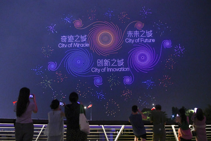 2024年9月26日,市民、游客在深圳灣觀看廣東深圳大漠大智控技術(shù)有限公司呈現(xiàn)的無人機(jī)編隊(duì)表演。新華社記者 梁旭 攝