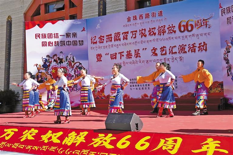 圖為拉薩市城關(guān)區(qū)金珠西路街道舉辦紀(jì)念西藏百萬農(nóng)奴解放66周年暨“四下基層”文藝匯演活動(dòng)現(xiàn)場(chǎng)。通訊員 扈顯嶺 攝
