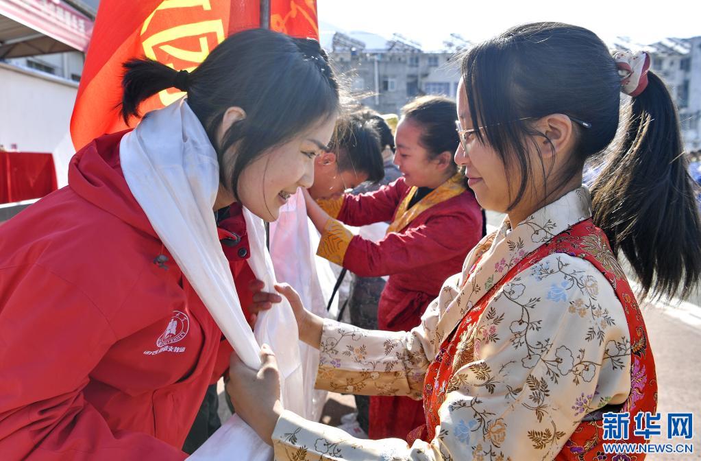 山南市東輝中學(xué)學(xué)生代表向湖北大學(xué)碩士研究生支教團成員獻(xiàn)哈達(dá)(3月29日攝)。新華社記者 張汝鋒 攝