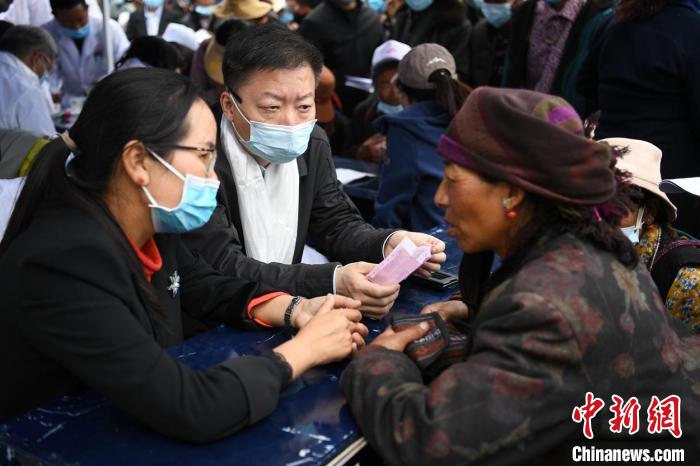 上海新華醫(yī)院副院長(zhǎng)潘曙明教授在薩迦縣義診現(xiàn)場(chǎng)為藏族民眾診病。 孫國(guó)根 攝