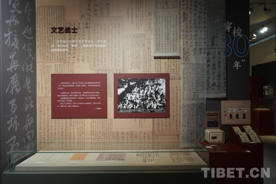 圖為中國(guó)現(xiàn)代文學(xué)館內(nèi),“山河跡憶——手稿里的抗戰(zhàn)中國(guó)”展覽中“文藝戰(zhàn)士”展示墻 攝影:郭睿佳