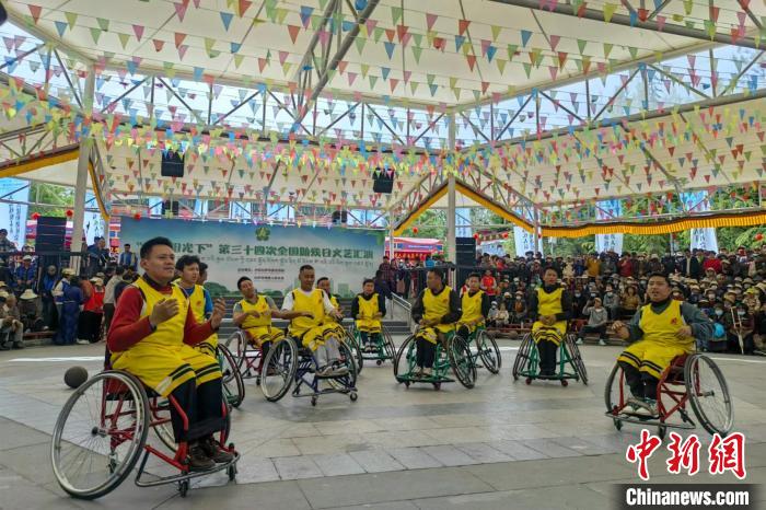 圖為助殘日當天,西藏輪椅籃球隊成員表演節(jié)目《健康西藏動起來》。西藏自治區(qū)殘聯(lián)供圖