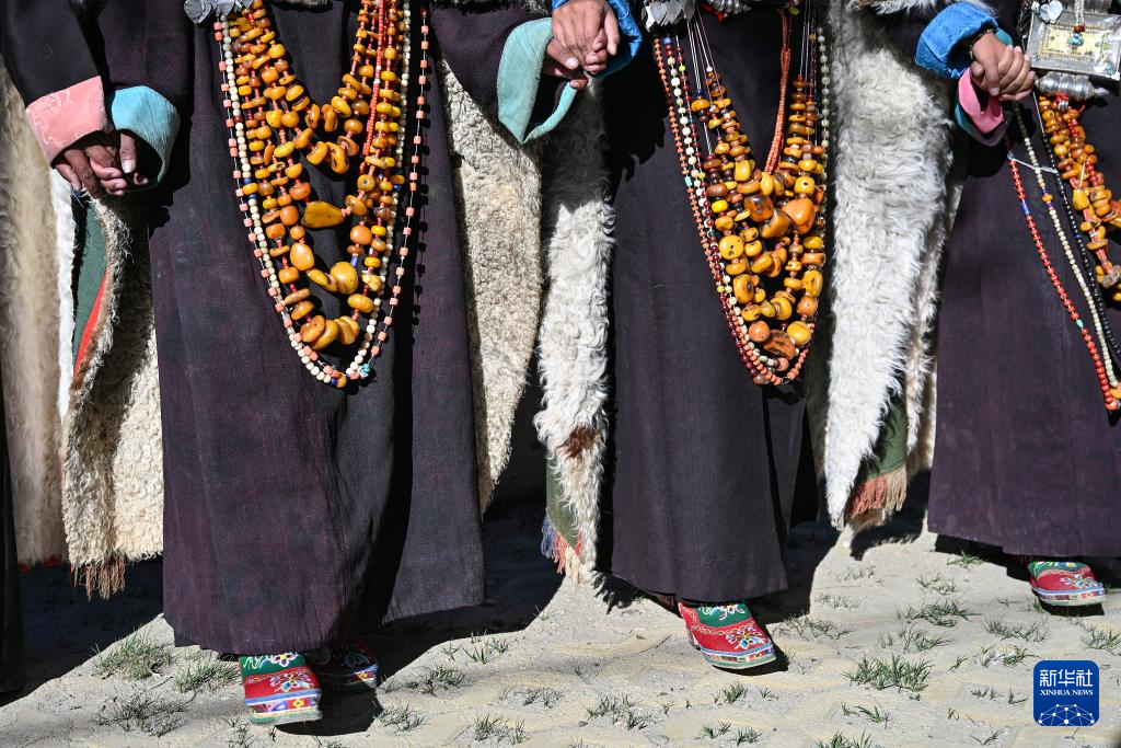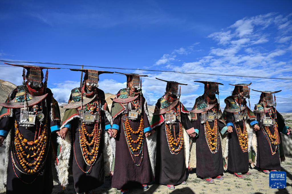 9月9日,在西藏阿里地區(qū)普蘭縣科迦村,村民身著普蘭服飾表演宣舞。新華社記者 孫瑞博 攝