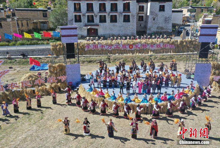 9月22日,2024年西藏“中國農(nóng)民豐收節(jié)”慶祝活動在山南市瓊結(jié)縣拉玉鄉(xiāng)強(qiáng)吉村舉行。活動以“學(xué)用‘千萬工程’禮贊豐收中國”為主題,由西藏各地(市)民間演出隊為大家獻(xiàn)上一場具有地域特色、體現(xiàn)農(nóng)牧民豐收喜悅的歌舞盛宴。圖為演出現(xiàn)場。(無人機(jī)照片)