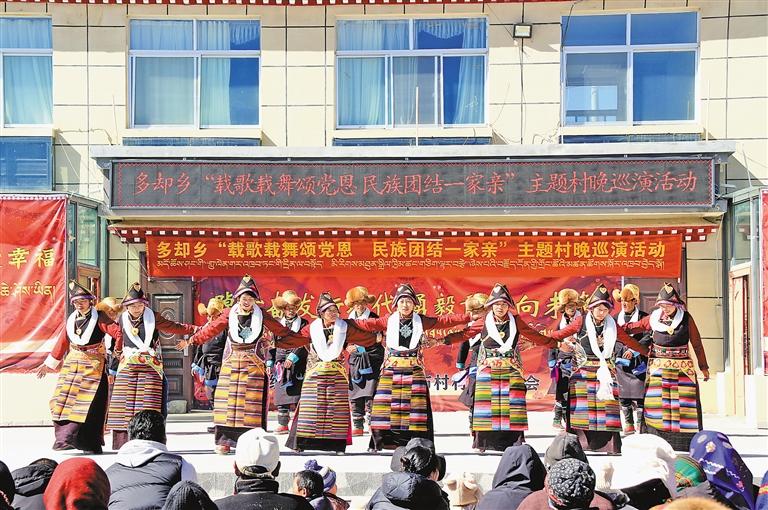 此次巡演的節(jié)目堅(jiān)持“以人民為中心”的創(chuàng)作導(dǎo)向。巡演過(guò)程中,舞蹈《果諧》《幸福家園》《民族團(tuán)結(jié)一家親》,歌曲《再唱山歌給黨聽(tīng)》《圣地拉薩》《羊卓嘎瑪林》,小品《幸福生活》《村規(guī)民約》等輪番上陣,為觀眾們帶來(lái)了一場(chǎng)場(chǎng)精彩紛呈的視聽(tīng)盛宴,贏得了觀眾陣陣掌聲,展現(xiàn)了多卻鄉(xiāng)群眾昂揚(yáng)向上的精神風(fēng)貌。