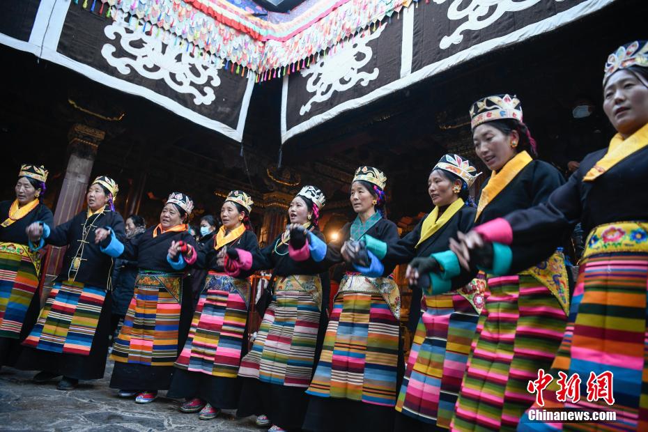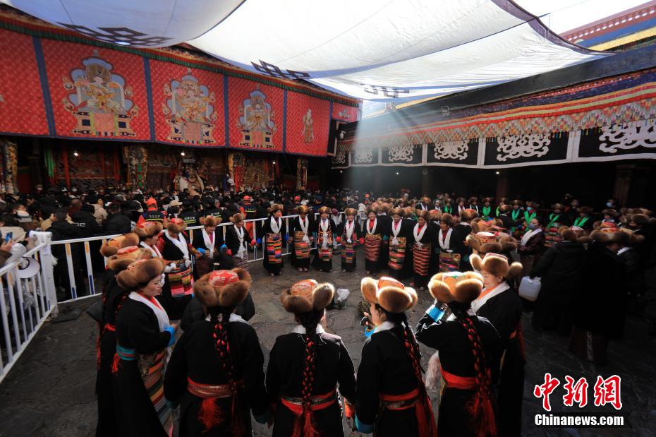 圖為身著民族服裝的信眾在大昭寺內(nèi)載歌載舞。