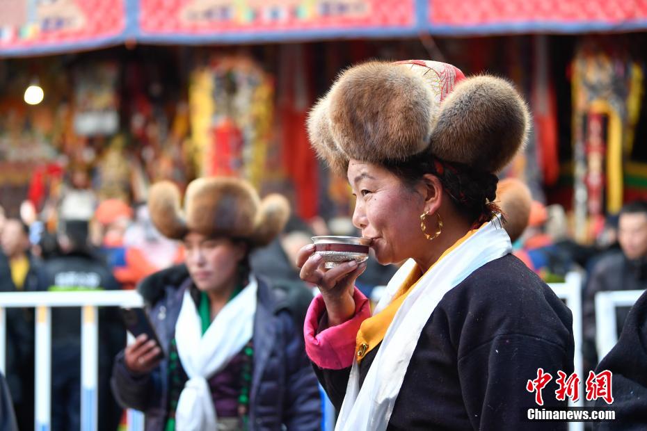 圖為一位藏族婦女品嘗青稞酒。