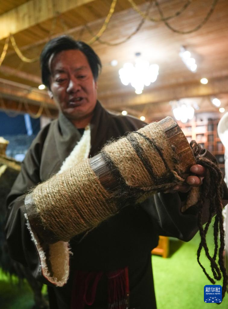 當(dāng)?shù)孛袼讓<邑暡悸逋凇澳寥藢殠臁辈厥讲桊^展示擠羊奶用的木桶(2月13日攝)。新華社記者 晉美多吉 攝