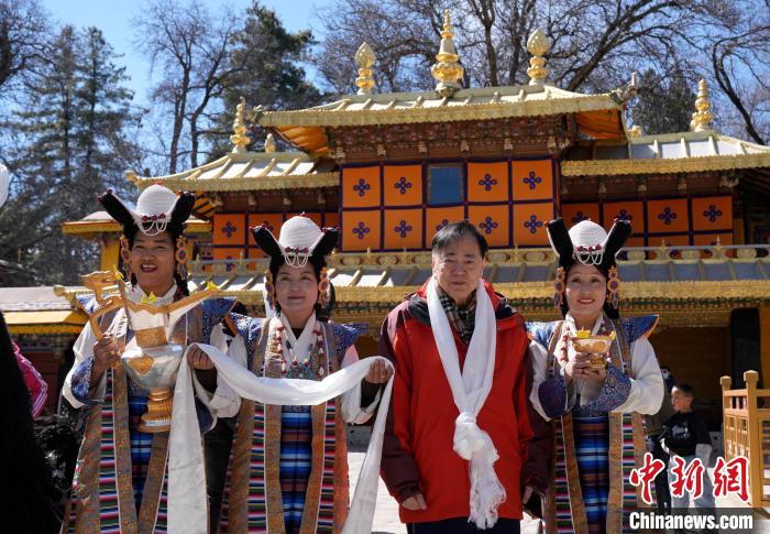 2月20日,2025年香港至拉薩航班首航旅行團歡迎儀式現(xiàn)場,香港游客梁籌庭(右二)在羅布林卡與身著拉薩傳統(tǒng)服飾的工作人員合影留念。李林 攝