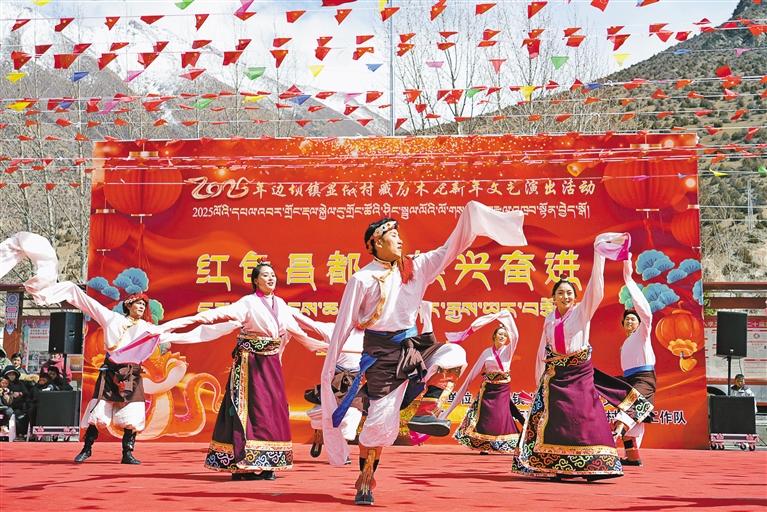 2月28日,全國(guó)“村晚”示范點(diǎn)昌都市邊壩縣顯俄村熱鬧非凡,一場(chǎng)以“紅色昌都·振興奮進(jìn)”為主題的“村晚”文藝演出在此舉行,吸引了1000余名群眾觀看。活動(dòng)現(xiàn)場(chǎng),各族群眾身著盛裝,共同欣賞這場(chǎng)文化盛宴。演出人員用優(yōu)美的舞姿、歡快的節(jié)奏,為觀眾帶來(lái)一場(chǎng)活力與激情四溢的視聽(tīng)享受。
