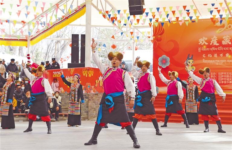 圖為2月28日,“文化進(jìn)萬家”惠民演出活動(dòng)在拉薩市宗角祿康公園舉行,精彩紛呈的歌舞節(jié)目輪番上演。記者 旦增蘭澤 攝