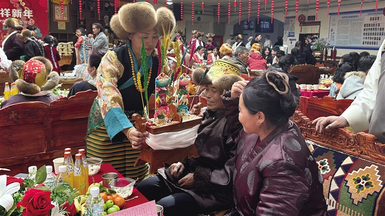 拉薩市社會福利院工作人員白央告訴記者,藏歷新年前一周,她們就為老人們洗澡、修剪指甲,對福利院進(jìn)行全面大掃除。為營造節(jié)日氛圍,還提前為老人裝扮居住環(huán)境,掛上紅燈籠,擺上切瑪盒等?!斑@是我在福利院工作的第二年。藏歷新年雖不能陪伴在父母身邊,但與老人們一同過年,讓我深感幸福且意義重大。”