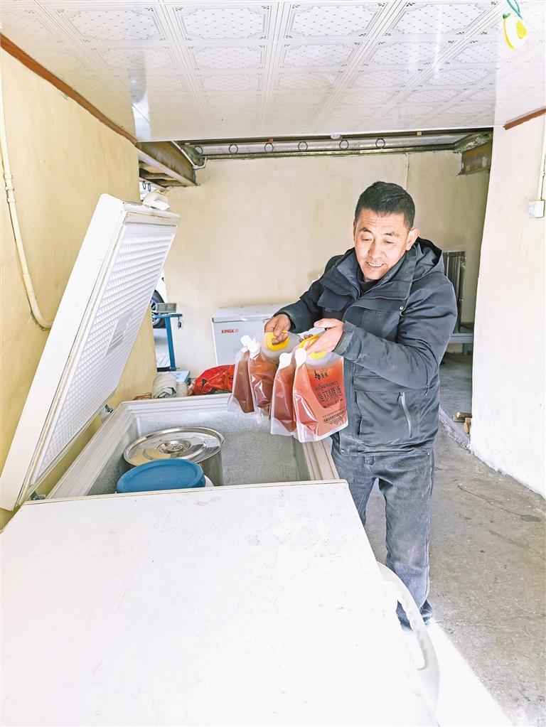 洛桑多吉從冰柜中取出自釀的“強(qiáng)欽青稞酒”。