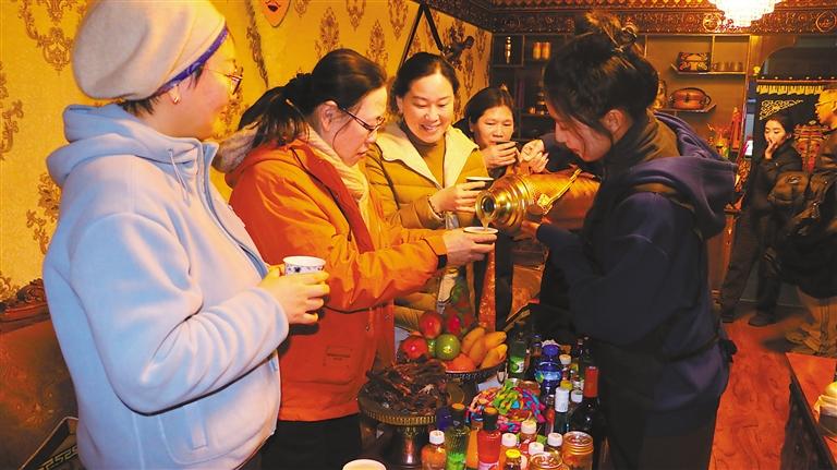 圖為山南市乃東區(qū)扎西曲登社區(qū)居民為游客倒酥油茶。記者 武沛濤 攝