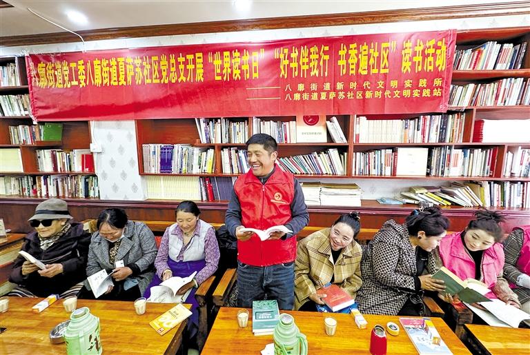 圖為4月23日,拉薩市八廓街道夏薩蘇社區(qū)開展“好書伴我行 書香遍社區(qū)”系列讀書活動。圖為社區(qū)工作人員在分享讀書心得。記者 白瑪澤旺 攝