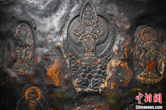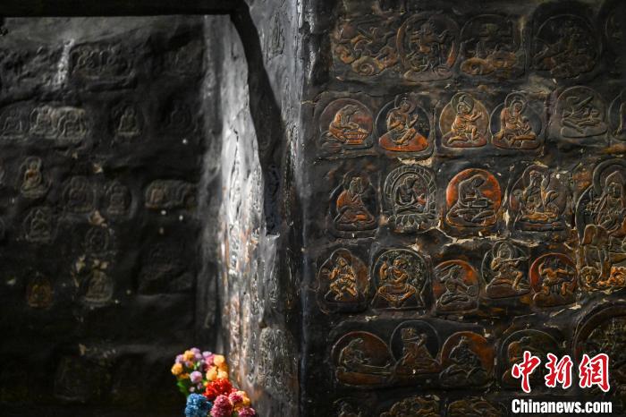 4月27日,記者探訪了當(dāng)雄縣貢堂鄉(xiāng)沖嘎爾村康馬寺的瑪尼拉康。瑪尼拉康是該寺除修行洞之外的早期宗教活動場所,也是寺院里最古老的建筑。這里保存著令人驚嘆的石刻造像墻,這些石刻距今已有三百年歷史?,斈崂低庥^普通,但其室內(nèi)六面墻上整齊地貼滿了浮雕石刻板,共計1213塊(僅一塊缺失)。石刻內(nèi)容豐富,涵蓋了藏傳佛教各宗各派的本尊、祖師、佛母菩薩等,造型多姿多樣,線條清晰流暢。這處石刻造像墻對于研究西藏傳統(tǒng)雕刻、藏傳佛教以及歷史具有重大意義。中新社記者 貢嘎來松 攝