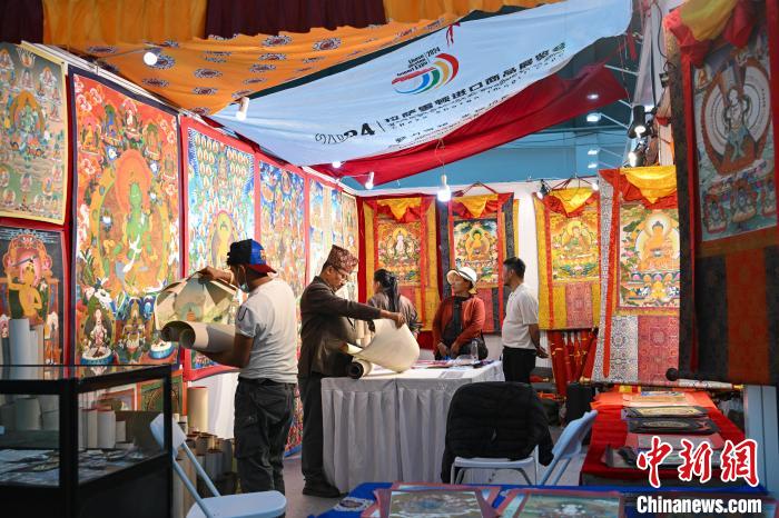 圖為拉薩進口商品展覽會現(xiàn)場,顧客在選購唐卡。中新社記者 貢嘎來松 攝