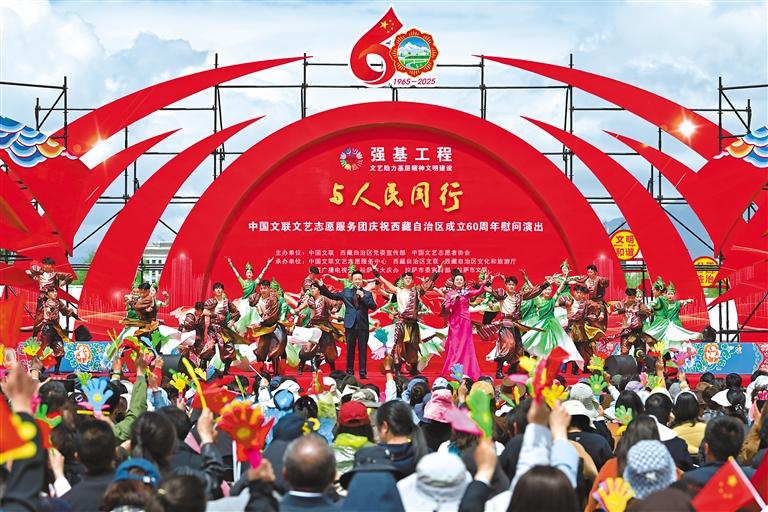 上午10時(shí)整,“與人民同行”中國(guó)文聯(lián)文藝志愿服務(wù)團(tuán)慶祝西藏自治區(qū)成立60周年慰問演出,在歌舞《鼓舞西藏》的熱烈氛圍中正式開場(chǎng)。