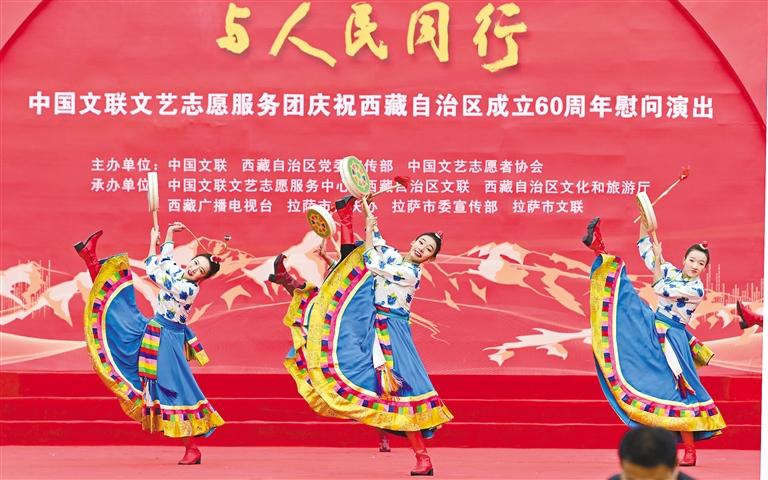 5月23日,在中國文藝志愿者服務(wù)日到來之際,由中國文聯(lián)、西藏自治區(qū)黨委宣傳部、中國文藝志愿者協(xié)會共同主辦的“與人民同行”慰問演出在西藏會展中心廣場隆重舉行。這場慶祝西藏自治區(qū)成立60周年的文藝盛宴,在歌舞《鼓舞西藏》激昂的節(jié)奏中拉開帷幕。