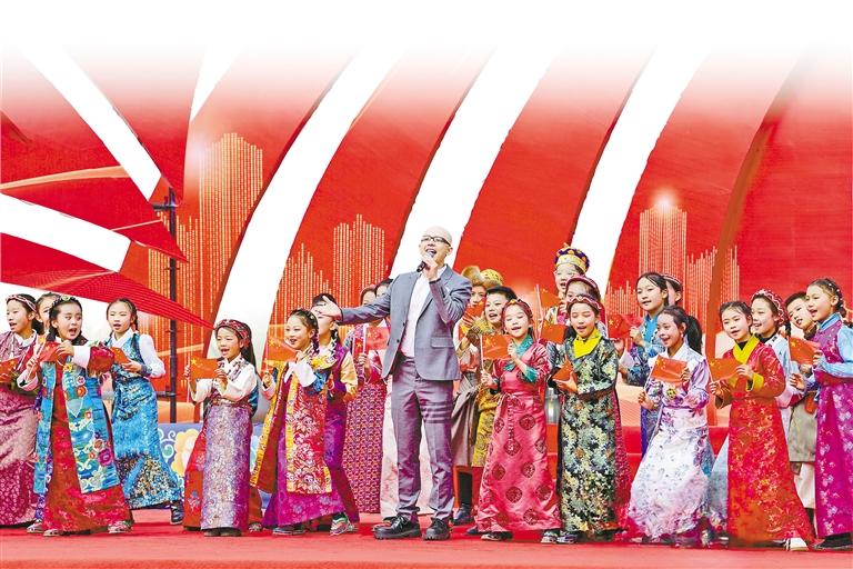 歌手平安與西藏珠峰少年合唱團帶來歌曲《我愛你中國》。(其余圖片均由記者 唐斌 白瑪澤旺 王敏 丹增群培 旦增蘭澤 攝)
