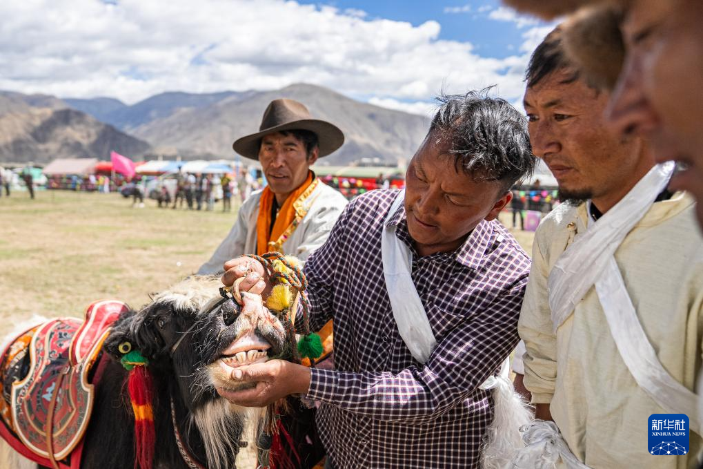 5月29日,工作人員通過檢查牦牛牙口判斷其是否具備參賽資格。新華社記者 丁增尼達(dá) 攝