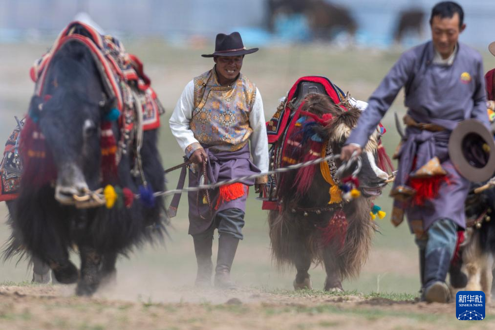 5月29日,農(nóng)牧民群眾在賽牦牛比賽前,牽著牦牛前往起點。新華社記者 丁增尼達(dá) 攝