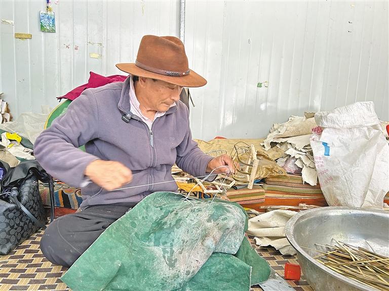 在合作社里,次仁展示了他制作工藝牛皮船的技藝。只見他盤起腿席墊而坐,將泡在水盆里的細(xì)竹簽?zāi)闷穑瑑蛇呄鞒杉饨?,一根根橫豎排列,很快制作出一個(gè)小船架,再用細(xì)繩打結(jié)后,從一旁的尼龍袋里取出早已揉捏好的羊皮(工藝牛皮船的制作,一般用羊皮代替牛皮),麻利地剪裁,一針針地縫制,不到十分鐘的功夫,一只精美的工藝牛皮船已然在老手藝人的手上,熠熠生輝。
