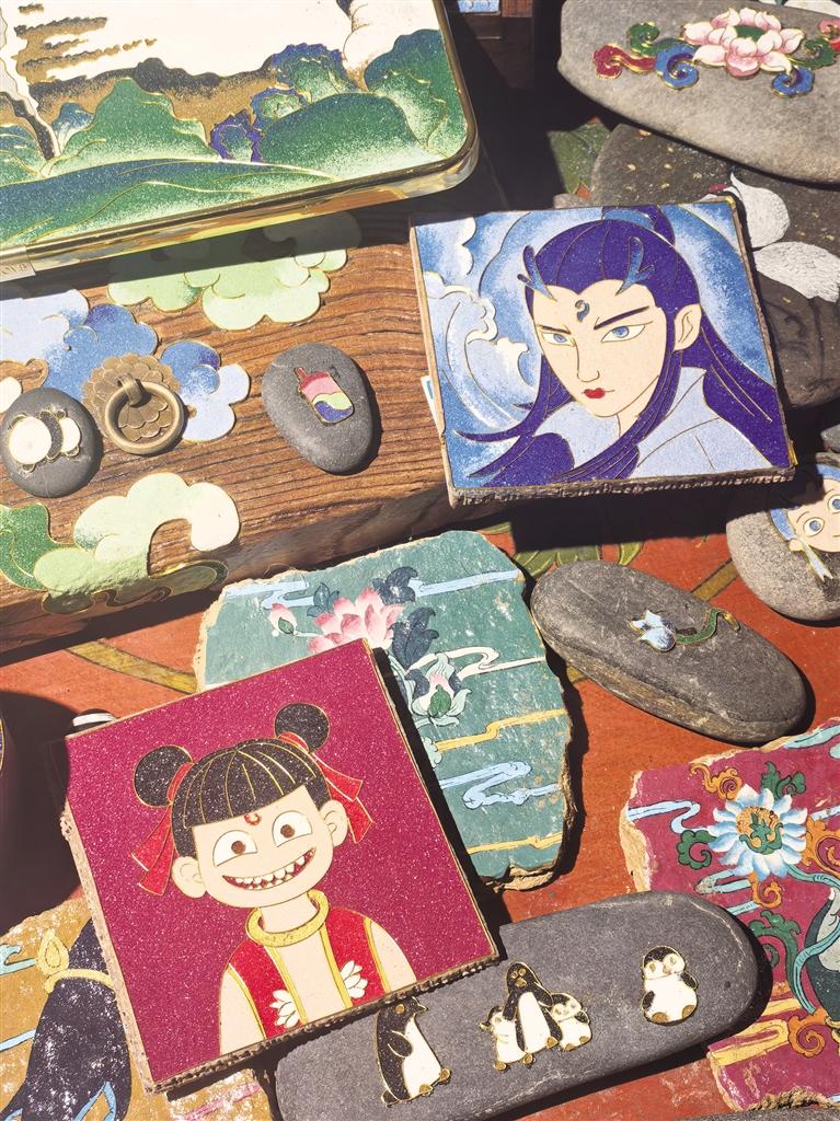 只見占地不到20平方米的小屋內(nèi),擺放著各類唐卡畫作。既有傳統(tǒng)唐卡作品,亦有動畫人物的“繪像”。描邊的金屬絲和光滑的質(zhì)感表面讓人忍不住駐足欣賞。店里陳列著巴掌大小的掐絲唐卡,金線掐絲在礦物顏料映襯下流光溢彩。畫師兼老板的南吉合多杰正在完成一份岡仁波齊的客單:“勉薩畫派的特色是線條細(xì)膩,顏色過渡自然。選好圖案后,會根據(jù)載體材質(zhì)、大小(例如石頭大小、木板長短等)收費(fèi)?!彼贿呎f著,一邊用特制工具將顏料注入金絲隔斷。