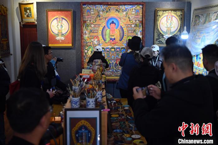 6月10日,來自美國、加拿大、瑞士、韓國等國家和地區(qū)的中外記者、網(wǎng)絡(luò)達人走進唐卡小鎮(zhèn)中的一家畫室觀摩采訪。九美旦增 攝