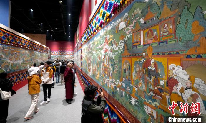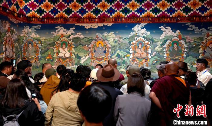6月14日,描繪吐蕃贊普世系史的唐卡《吐蕃贊普世系大唐卡金子明鏡》在西藏博物館展出。該幅唐卡寬1.8米、長200米,由平措多布杰大師等30多位孜東唐卡畫師歷經(jīng)多年繪制完成。圖為觀眾正在欣賞展覽中的唐卡。中新社記者 李林 攝