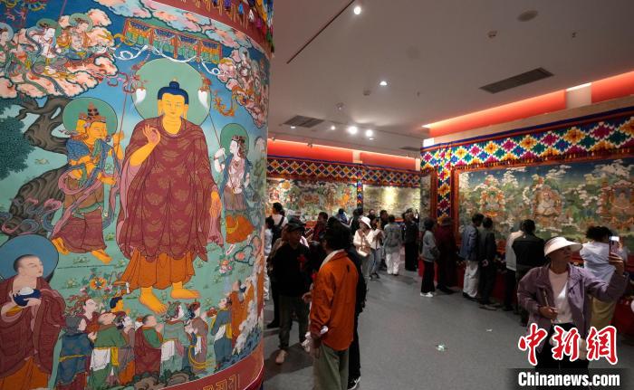 圖為觀眾正在欣賞展覽中的唐卡。中新社記者 李林 攝