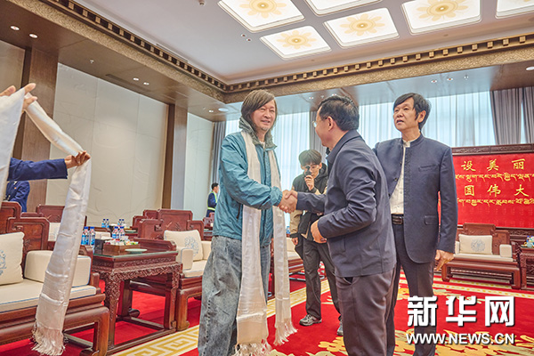 西藏自治區(qū)黨委宣傳部副部長、文化和旅游廳黨組書記肖傳江向藝術(shù)家們敬獻(xiàn)哈達(dá)