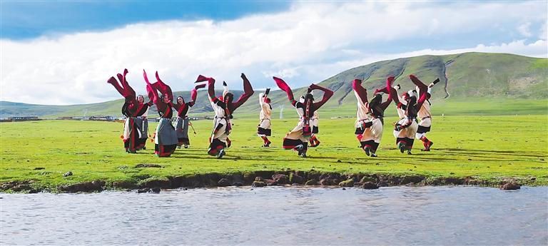 近年來(lái),那曲文旅局以那曲傳統(tǒng)鍋莊舞展演為突破口,進(jìn)一步推進(jìn)那曲優(yōu)秀傳統(tǒng)文化創(chuàng)造性轉(zhuǎn)化和創(chuàng)新性發(fā)展,全力打響那曲鍋莊舞品牌。 圖為那曲市群眾藝術(shù)鍋莊隊(duì)隊(duì)員在草原上跳鍋莊舞。(那曲市文旅局非遺處提供)