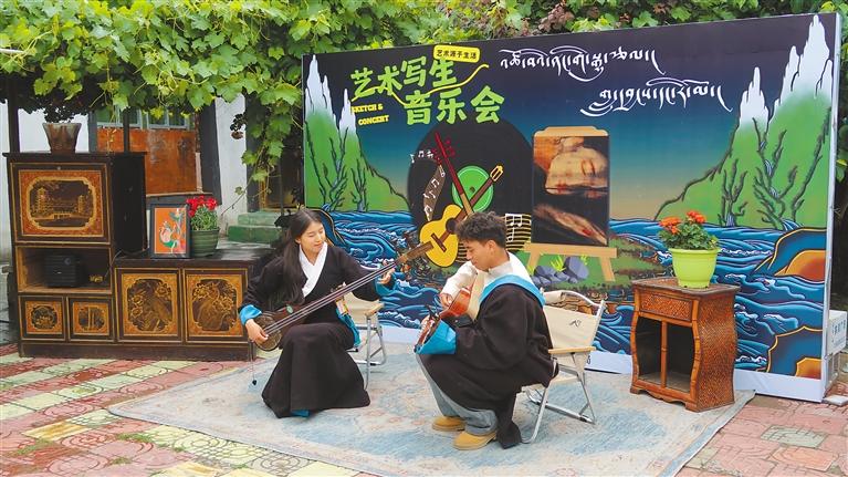 在音樂(lè)鑒賞環(huán)節(jié),拓崗扎念樂(lè)隊(duì)將傳統(tǒng)扎念琴演奏與現(xiàn)代音樂(lè)結(jié)合,表演了《卓木仁青崗》等曲目;青年歌手次仁羅布演唱藏族民歌,展現(xiàn)非遺特色。在藝術(shù)對(duì)談中,青年畫家雍忠卓瑪分享了自己克服身體障礙堅(jiān)持創(chuàng)作的經(jīng)歷,圍繞“自然與藝術(shù)的關(guān)系”展開(kāi)討論,結(jié)合作品從藏族文化和鄉(xiāng)土景觀中獲取創(chuàng)作靈感的過(guò)程。在寫生體驗(yàn)環(huán)節(jié),活動(dòng)參與者以德慶鎮(zhèn)民居和周邊自然景色為素材進(jìn)行創(chuàng)作,雍忠卓瑪從構(gòu)圖、色彩運(yùn)用等方面給予指導(dǎo),幫助活動(dòng)參與者完成10余幅繪畫作品。