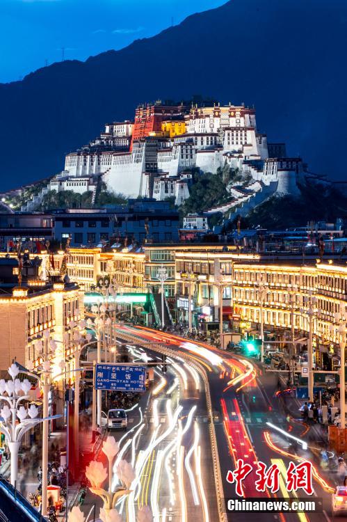 7月14日晚,在西藏拉薩,亮燈后的布達拉宮與北京東路交相輝映,夜色璀璨奪目。