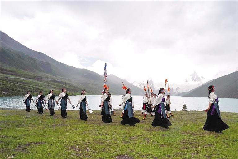 西藏那曲市比如縣藝術團的演員在薩普雪山景區(qū)為游客表演(7月19日攝)。新華社記者 晉美多吉 攝