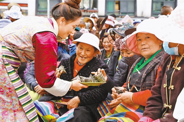 圖為今年端午節(jié)期間,洛扎縣委宣傳部、縣文旅局在德瑪龍村舉辦“培樹文明向上新風(fēng)·崇尚健康幸福生活”系列活動,為新村居民送粽子,以弘揚傳統(tǒng)節(jié)日文化凝聚民族團結(jié)奮進力量。 圖/文 記者 丹增平措