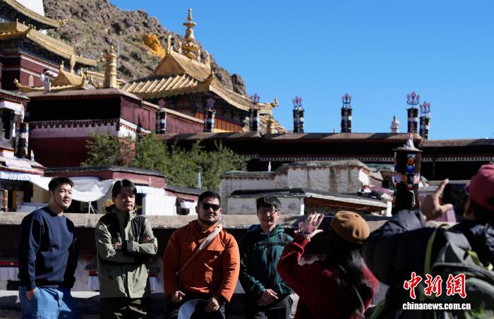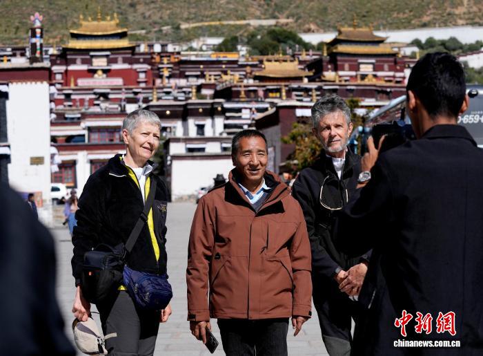 10月7日,外國(guó)游客在西藏日喀則市扎什倫布寺與導(dǎo)游合影留念。扎什倫布寺始建于公元1447年,是中國(guó)國(guó)家5A級(jí)旅游景區(qū)。憑借深厚的歷史底蘊(yùn)和獨(dú)特的文化魅力,吸引眾多中外游客參觀游覽。中新社記者 李林 攝