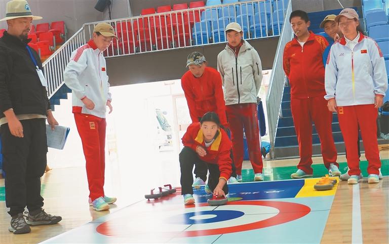 圖為運(yùn)動(dòng)員在進(jìn)行旱地冰壺比賽。記者 明吉 攝
