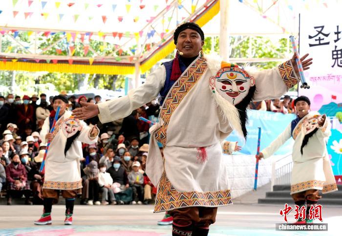 10月19日,“格桑花杯”拉薩市第六屆縣(區(qū))藝術(shù)團(tuán)文藝調(diào)演頒獎活動在布達(dá)拉宮腳下的宗角祿康公園舉行?,F(xiàn)場,拉薩市各縣(區(qū))藝術(shù)團(tuán)帶來精彩節(jié)目。圖為文藝調(diào)演頒獎活動上的文藝表演。中新社記者 李林 攝