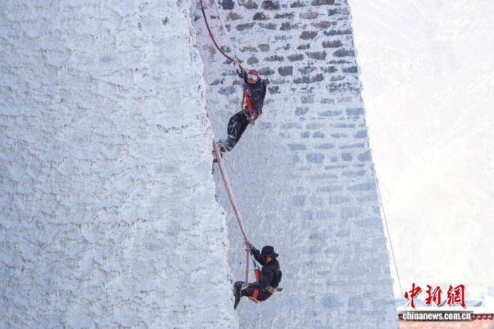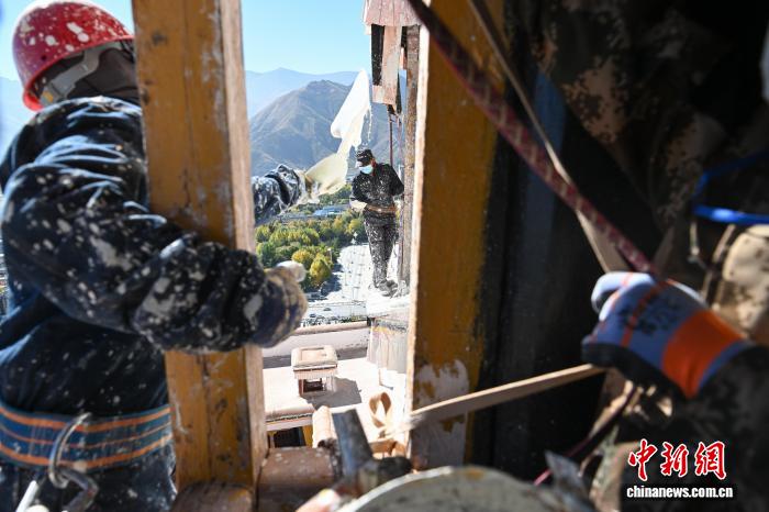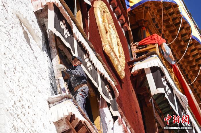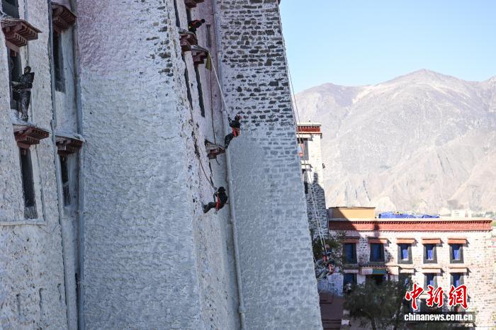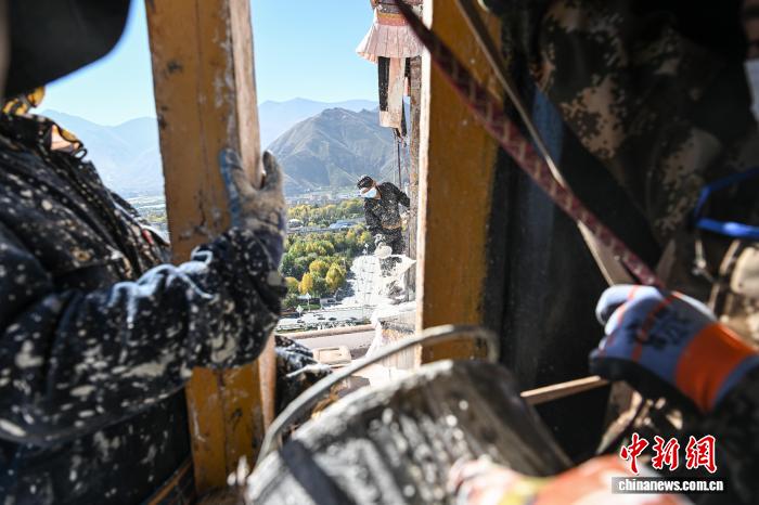 10月22日,西藏拉薩,布達(dá)拉宮管理處的工作人員和拉薩信眾自發(fā)參與其中對宮墻、窗框進(jìn)行整體粉刷,為布達(dá)拉宮“年度美容”。當(dāng)日,布達(dá)拉宮迎來了一年一度的粉刷季。圖為工作人員對布達(dá)拉宮外墻噴灑涂料。中新社記者 貢嘎來松 攝