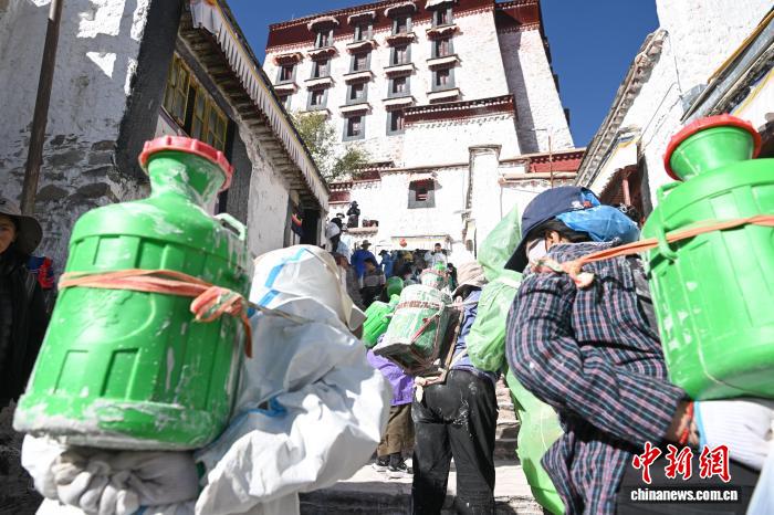 10月22日,西藏拉薩,布達(dá)拉宮管理處的工作人員和拉薩信眾自發(fā)參與其中對宮墻、窗框進(jìn)行整體粉刷,為布達(dá)拉宮“年度美容”。當(dāng)日,布達(dá)拉宮迎來了一年一度的粉刷季。圖為拉薩信眾排隊搬運布達(dá)拉宮粉刷使用的涂料。中新社記者 貢嘎來松 攝