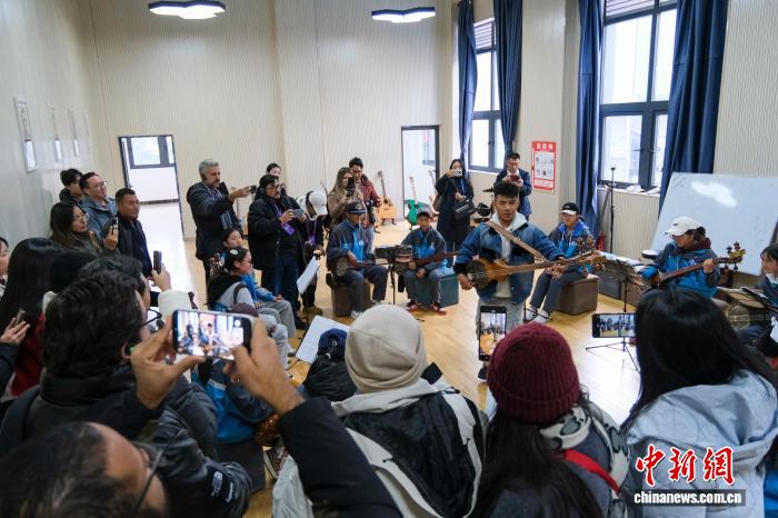 10月28日,拉美18個國家的21名記者、編輯等媒體從業(yè)者在西藏自治區(qū)林芝市巴宜區(qū)中學(xué)參訪,觀看師生們演奏藏族扎念琴。中新社記者 江飛波 攝