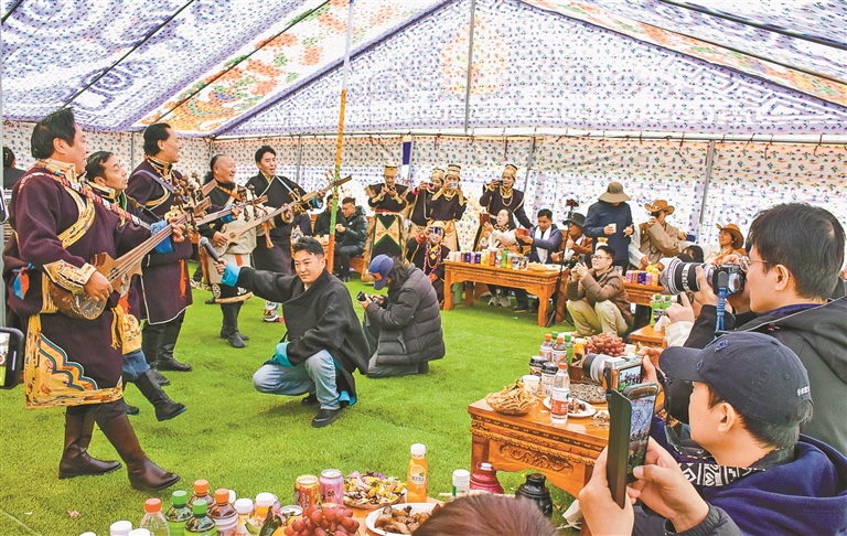 在篝火前,麥巴村的群眾和著音樂,跳著輕松歡快的工布鍋莊;帳篷里,遠(yuǎn)道而來的游客也換上工布藏裝,拍著照、聊著天,品嘗著甜美的青稞酒;非遺體驗區(qū),書法家們現(xiàn)場揮毫的漢藏雙語書法作品送出了一幅又一幅;美食街上,各個攤位前擠滿了準(zhǔn)備大快朵頤的人。