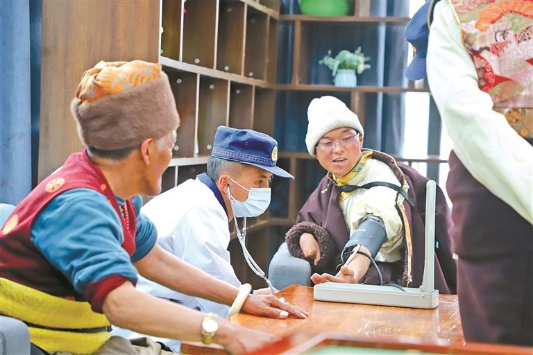 圖為衛(wèi)生員在為縣養(yǎng)老院的老人測量血壓。